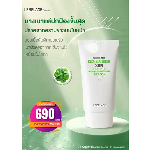 พิเศษ LEBELAGE PERFECT CICA SOOTHING SUN 50ml. ระหว่างวันที่ 4 เมษายน – 31 พฤษภาคม 2569 นี้เท่านั้น